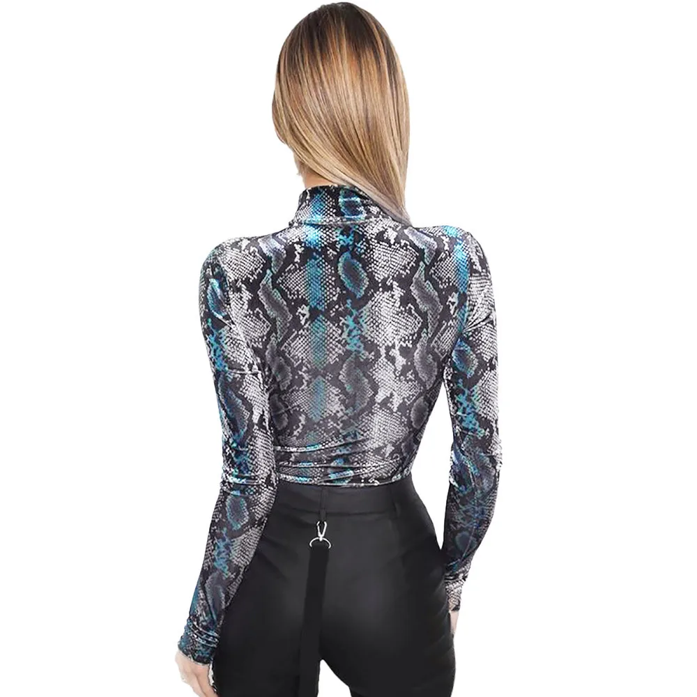 Review Top Summer Women Lady Clubwear Roller Collar Longarm Elastic Bodycon Sexy Thin Snake Skin Bodies Overal